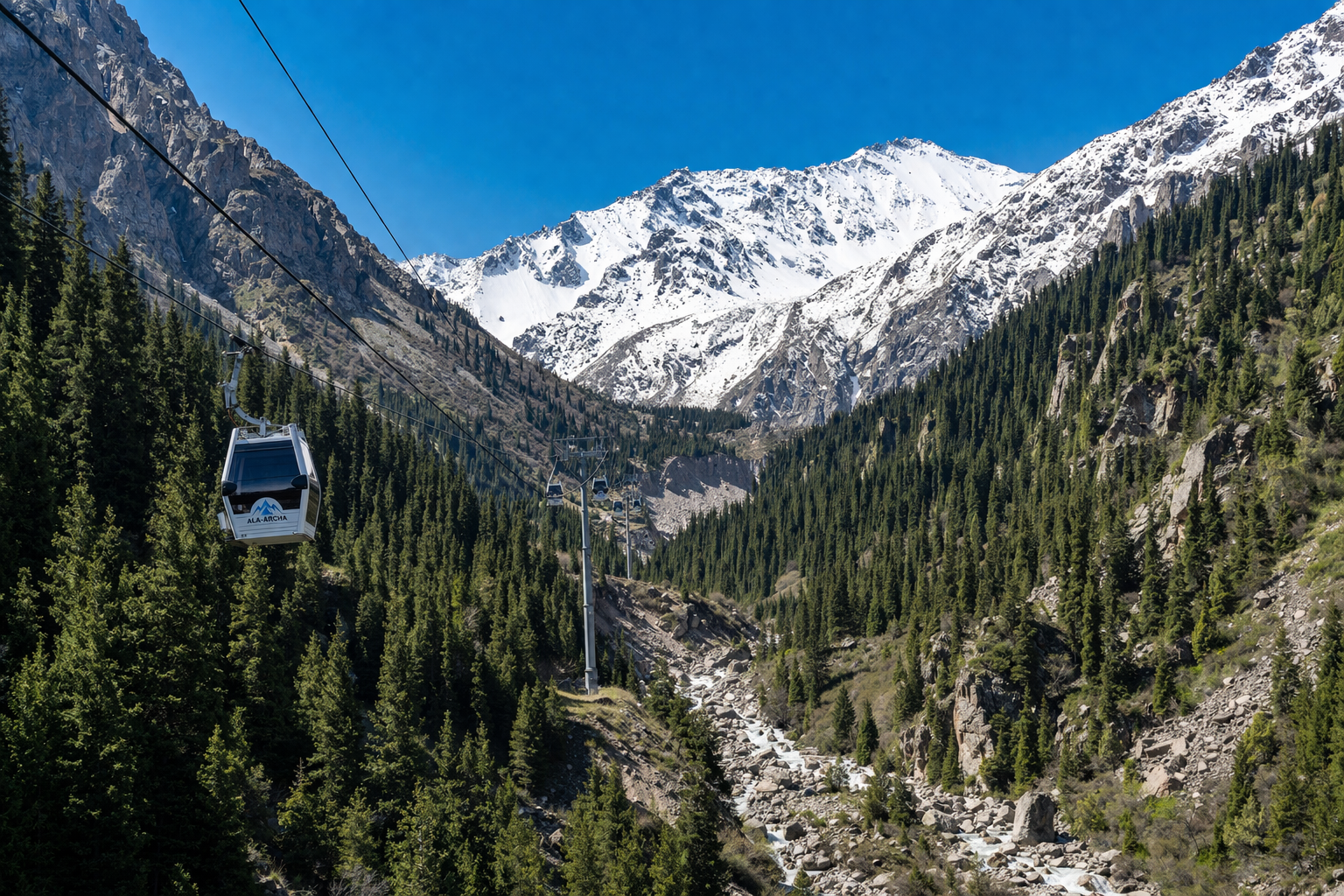 Если хочется увидеть горы почти сразу после выезда из Бишкека, Ала-Арча — один из самых удачных вариантов. Парк находится примерно в часе езды от столицы и подходит и для короткого выезда на полдня, и для полноценного дня с прогулками по ущелью и видами на пики Кыргызского Ала-Тоо.