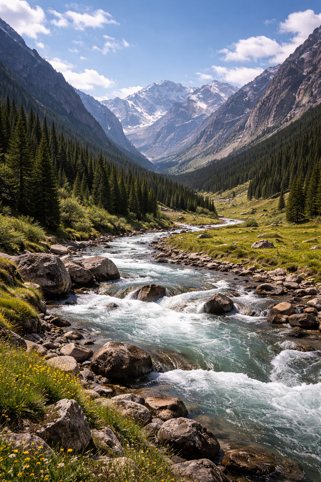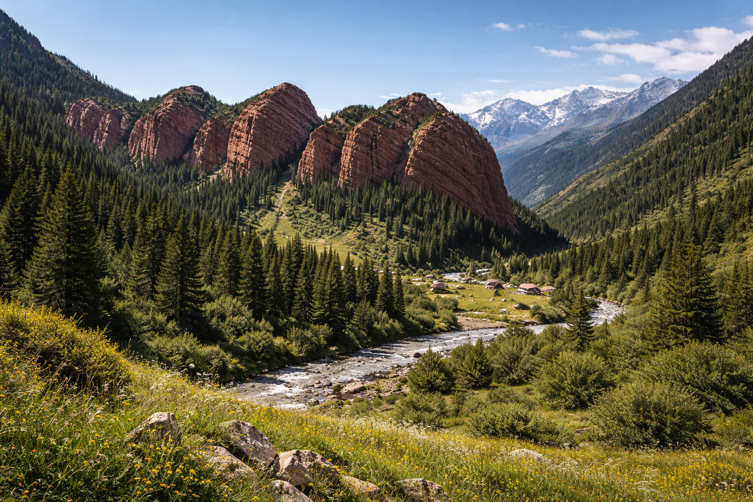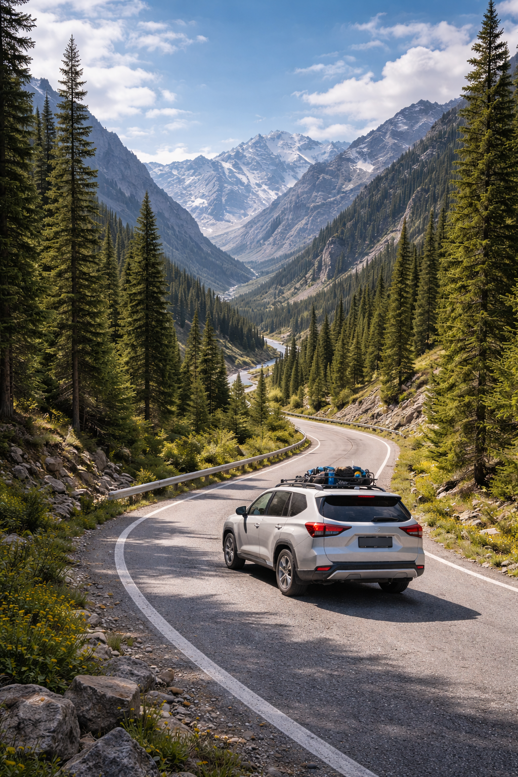 Чон-Кемин хорош тем, что это уже не “точка на карте”, а целая долина для спокойного автомобильного путешествия. Здесь красивые лесистые склоны, ущелья, река, гостевые дома и очень приятное ощущение тишины — именно то, за чем часто и берут машину, чтобы уехать подальше от городского ритма.