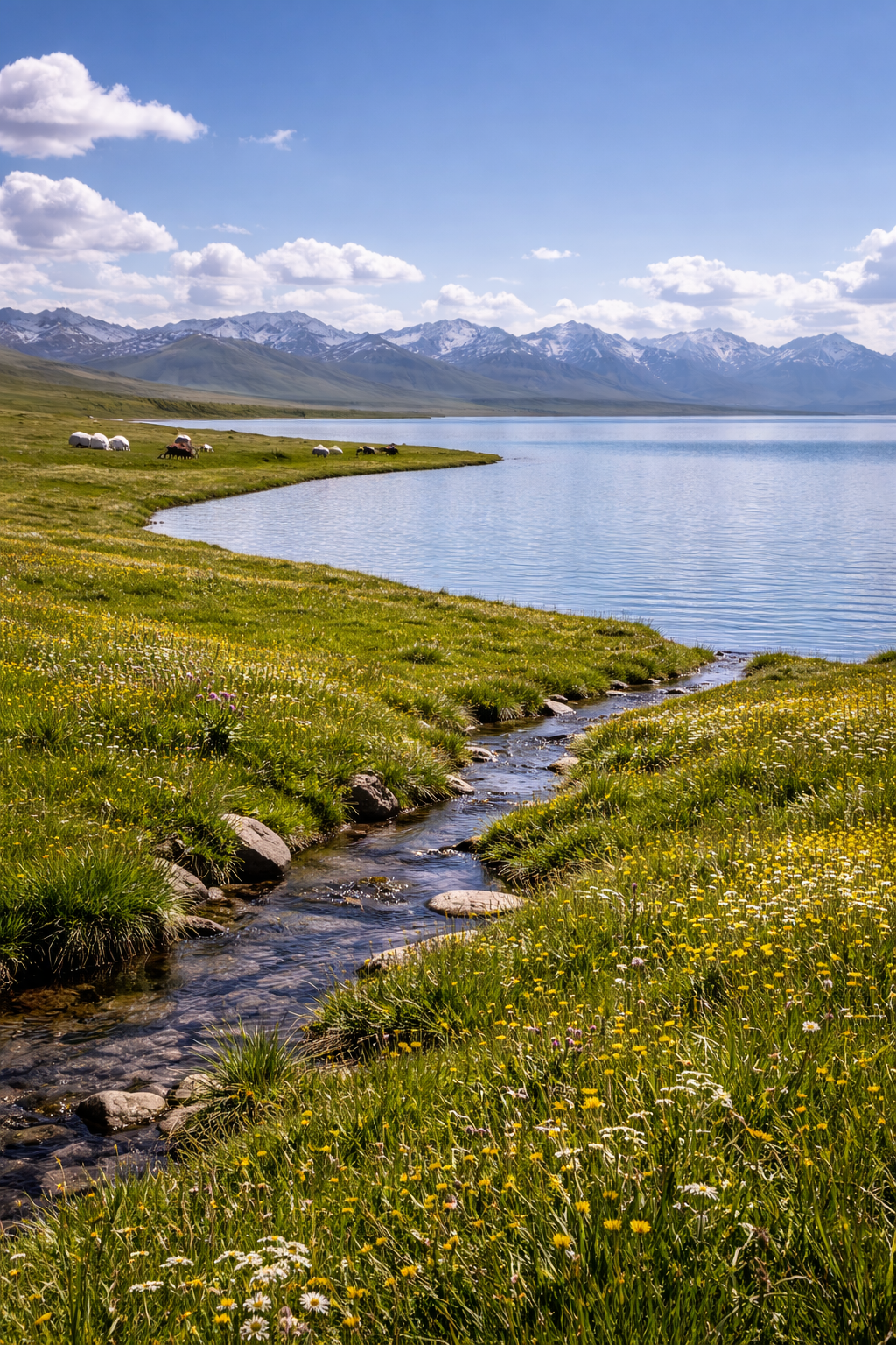 Сон-Куль — это уже не просто поездка, а настоящий опыт кочевого Кыргызстана. Озеро лежит на высоте 3016 метров, летом вокруг работают юрточные лагеря, а главное впечатление здесь — не только вода и горы, но и само чувство огромного высокогорного пространства.